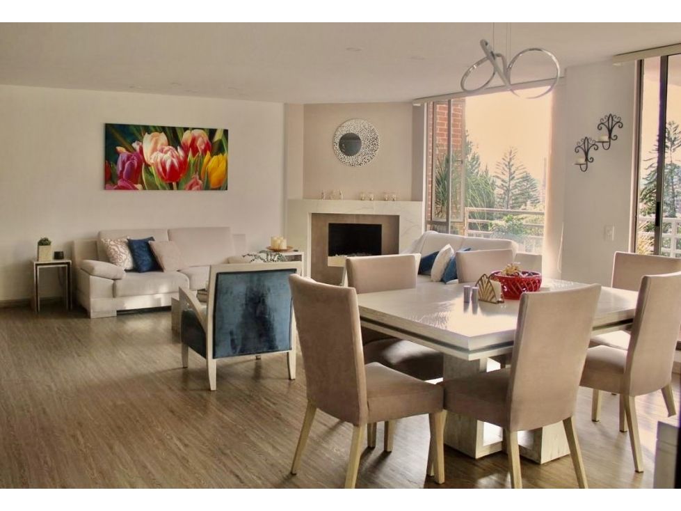 Excelente apartamento ubicado en quinto piso exterior, con iluminación natural, pisos en madera laminada, sala comedor en el mismo ambiente con chimenea en cetro, estudio abierto, baño social, cocina abierta en L con zona de lavandería en el mismo ambiente, dos habitaciones cada una con vestier, baño privado y jacuzzi, dos parqueaderos cubiertos en línea y depósito. El edificio cuenta con vigilancia 24/7, CCTV, recepción, ascensor, terraza y parqueadero de visitantes. Cerca a parques, jardines, universidad el Bosque, Éxito 134, y Cl 140. Facilidad de transporte público.